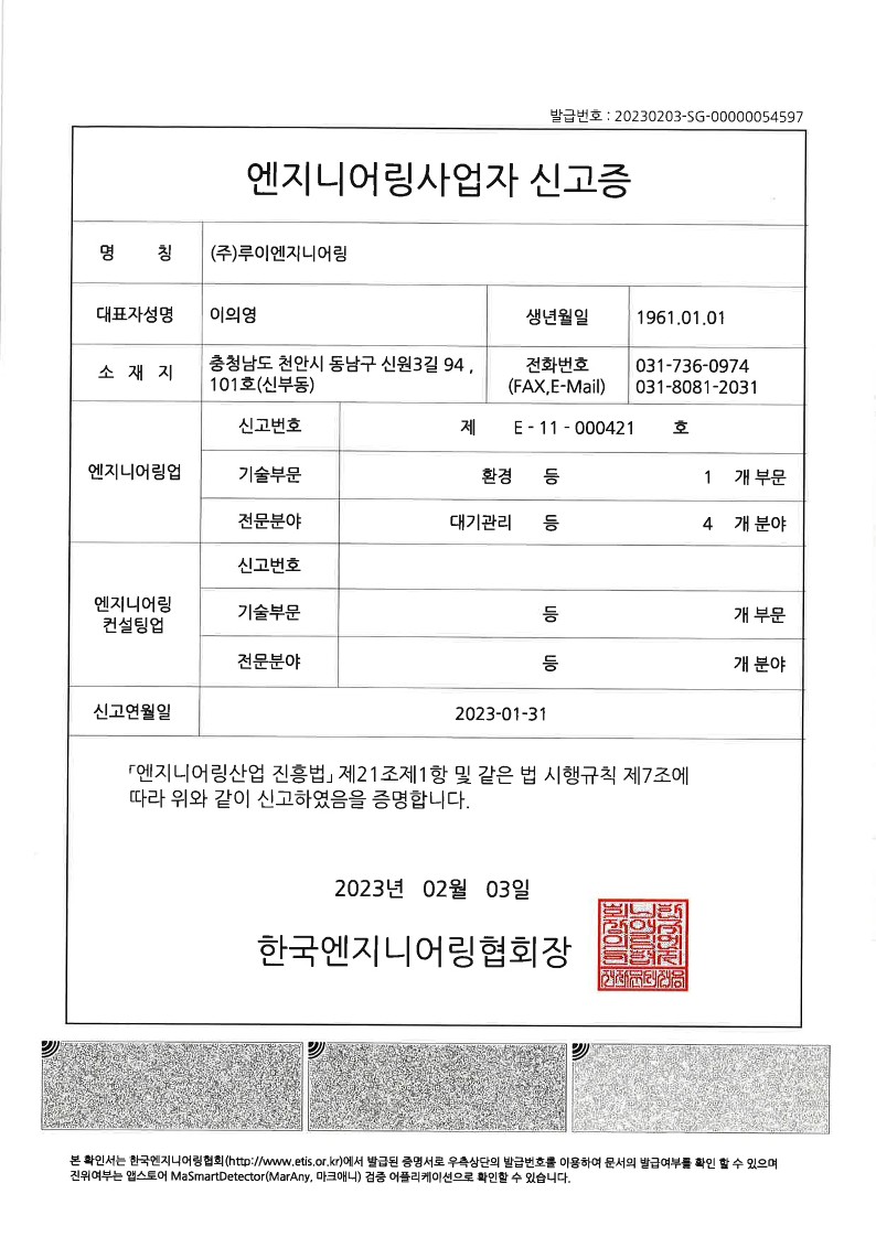 엔지니어링사업자 신고증(루이) 페이지 정보 작성자 최고관리자 댓글 0건 조회 182회 작성일 23-07-04 15:20 목록 본문 이전글소음진동분야 측정대행업 신고증(덕영) 23.07.04 다음글 제1종 환경영향평가업 신고증(덕영) 23.07.04 목록 댓글 0 댓글목록 등록된 댓글이 없습니다.