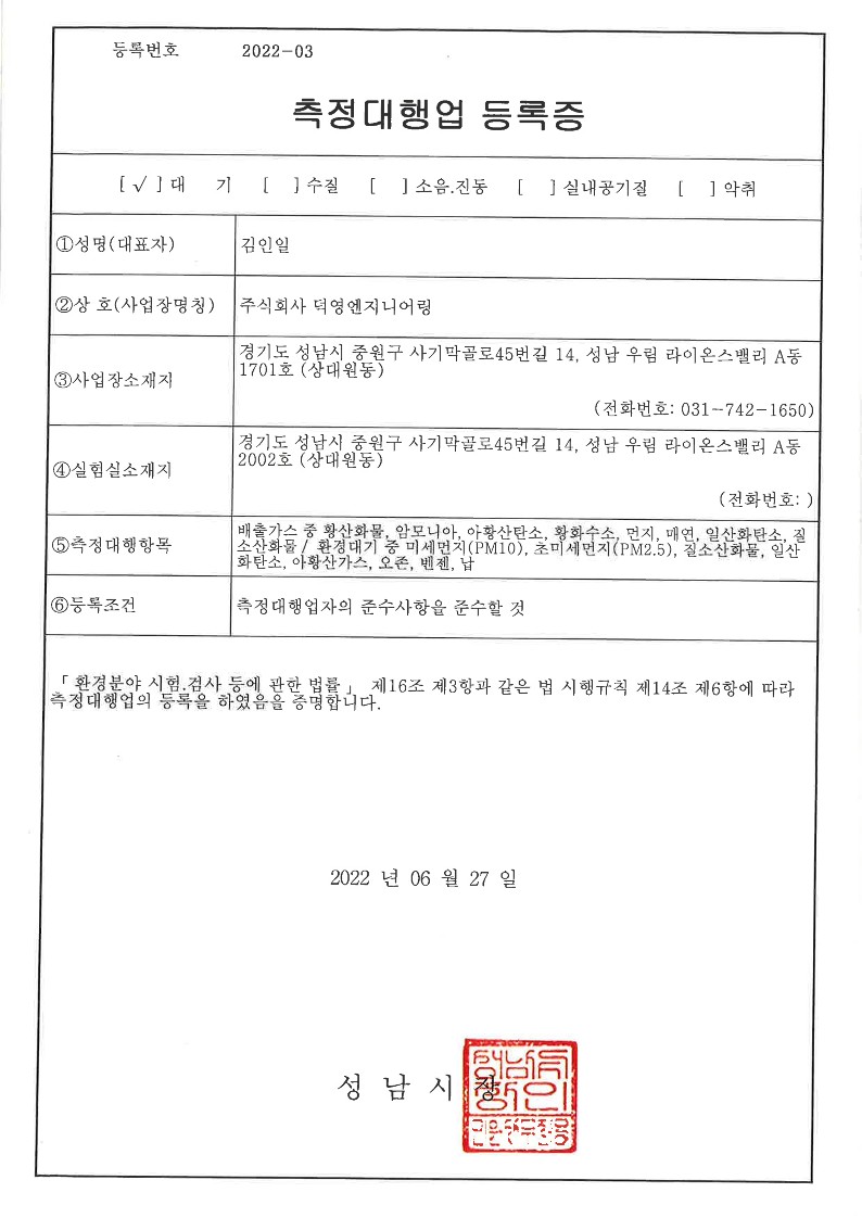 대기분야 측정대행업 신고증(덕영) 페이지 정보 작성자 최고관리자 댓글 0건 조회 204회 작성일 23-07-04 15:20 목록 본문 이전글기업부설연구소 신고증(덕영) 23.07.04 다음글 소음진동분야 측정대행업 신고증(덕영) 23.07.04 목록 댓글 0 댓글목록 등록된 댓글이 없습니다.